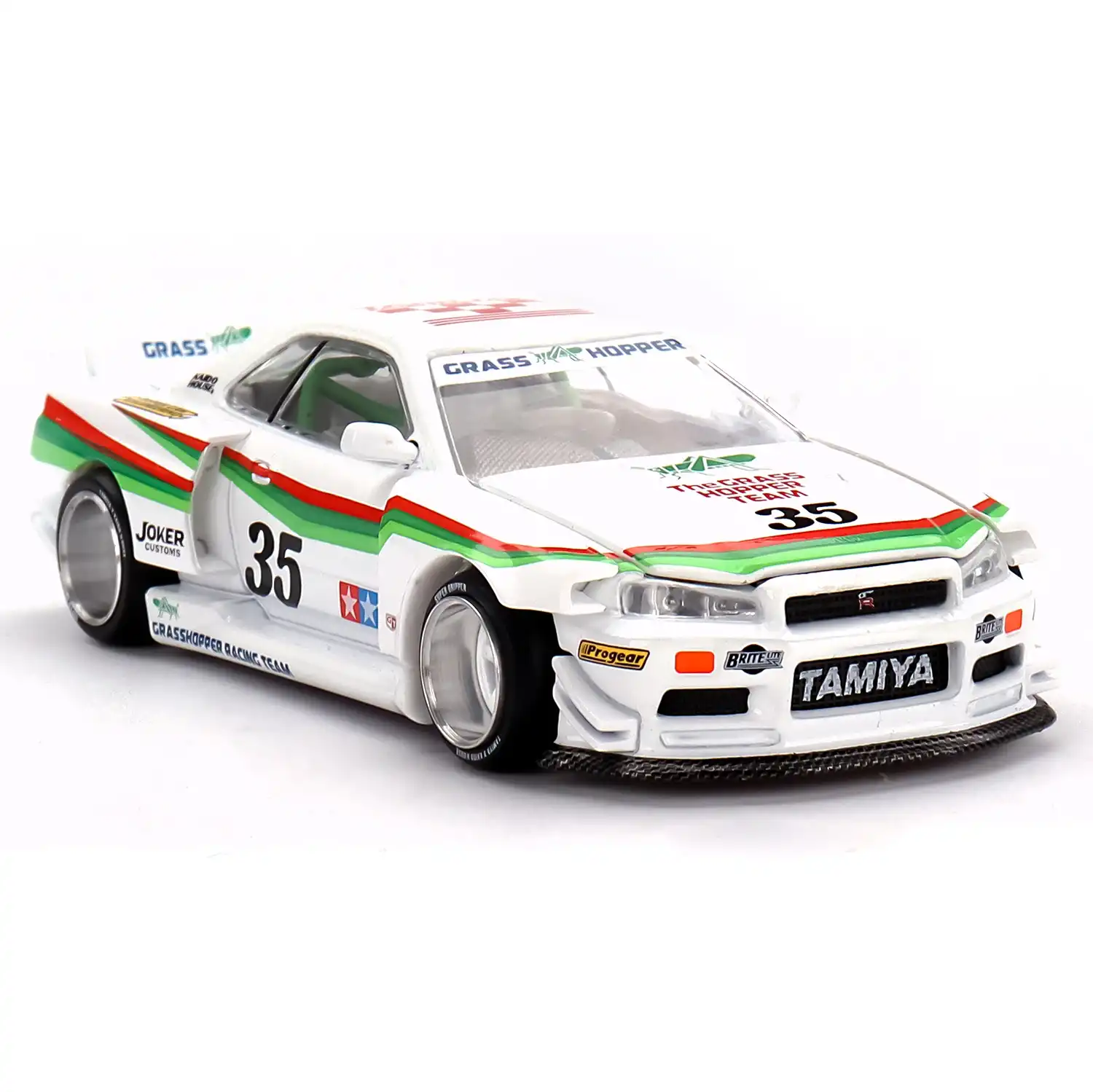 Mini GT ile Kaido House iş birliğinin dikkat çeken parçalarından bu R34 GT-R, Tamiya’nın ikonik “Grasshopper” temasını 1:64 ölçekte kusursuz baskılarla taşıyor. Döküm metal gövde, ayrı parçalı far/stop detayları, agresif tampon-ızgara formu, arka spoyler ve gerçekçi jant-fren setiyle premium bir görünüm sunar. Serbestçe dönen kauçuk lastikler diorama ve vitrin kullanımında doğal bir stance sağlar. Koleksiyonunuza hem Kaido House tasarım dili hem de Tamiya efsanesine selam niteliğinde özel bir parça eklemek isteyenler için ideal.
