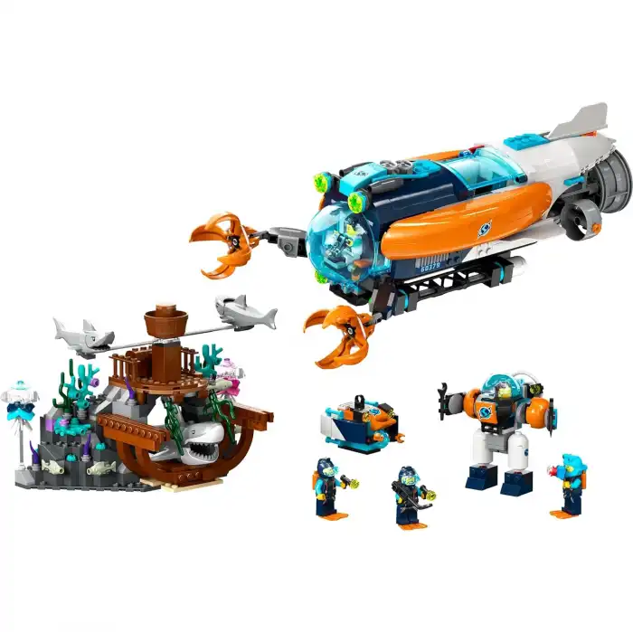 - Kutuda ne var? – Bir denizaltı, insansız su altı aracı, dalgıç giysisi, batık gemi ortamı, 6 kâşif minifigürü, 1 iskelet, 3 köpek balığı, 2 deniz anası ve 4 balık figürü yapmak için çocukların ihtiyacı olan her şey;