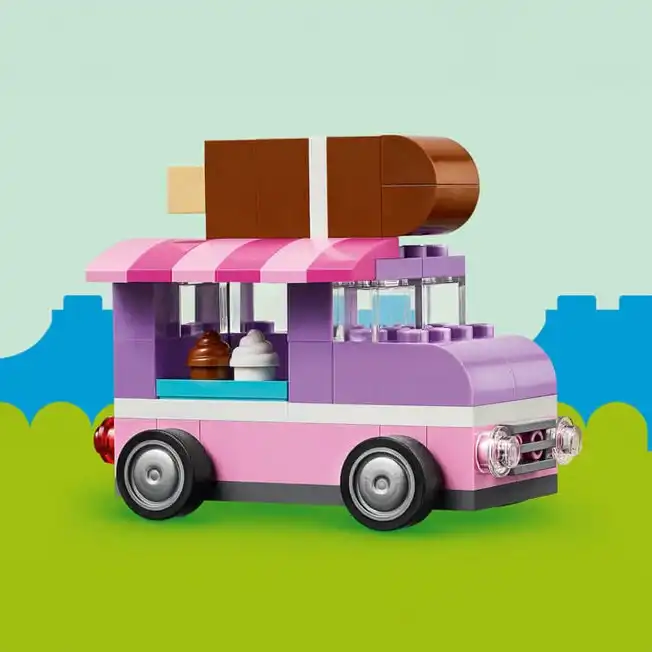 - Kamyon ve araba LEGO® setleri – Çocuklar, yapım parçalarıyla bir polis arabası, dondurma kamyonu, ATV, ön yükleyici, kamyonet, station wagon, arazi aracı ve limuzin yapabilir;