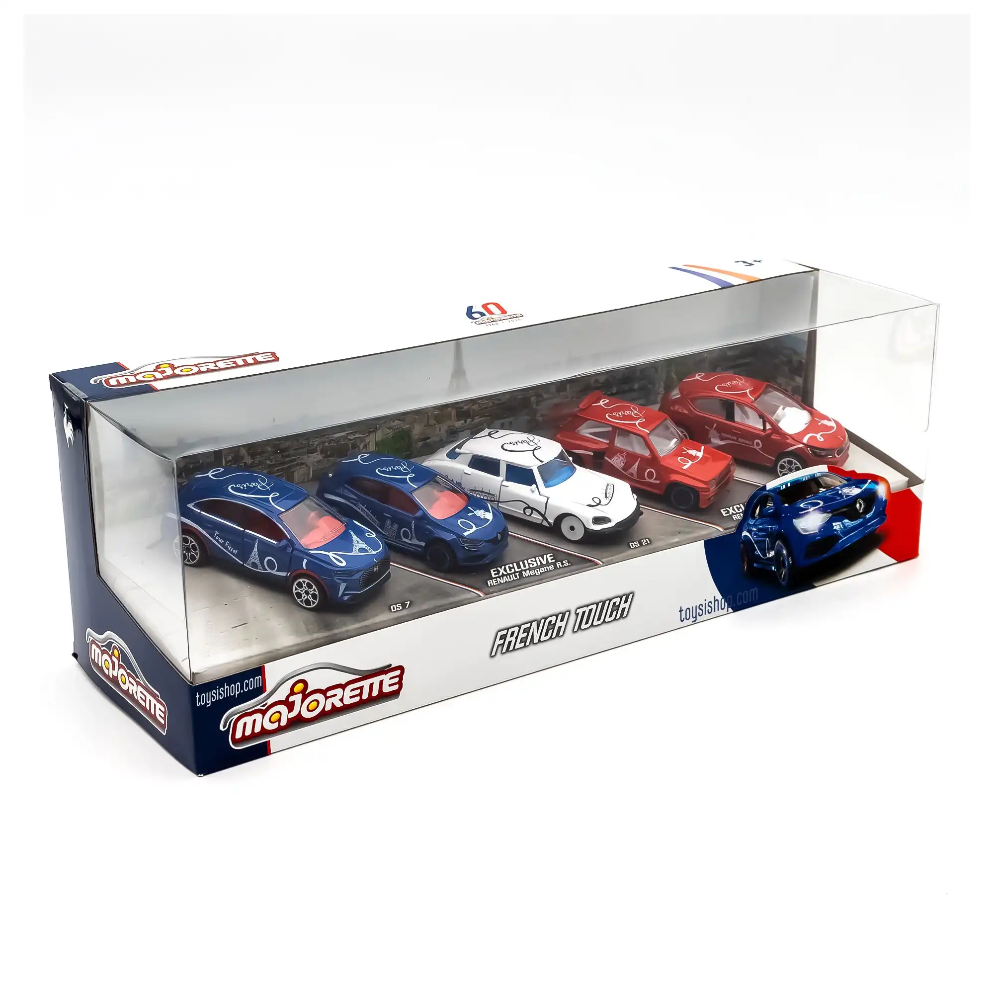 Bu özel hediye seti, şık Fransız tasarımlı 5 kalıp döküm araç içerir: Fransız bayrağının renklerini taklit etmek için mavi, beyaz veya kırmızı renklere sahip olan her araç, bir Fransız otomobil modelinin minyatür bir kopyasıdır ve Paris'in ikonik simgelerinin resimlerinin yanı sıra tavandaki benzersiz Paris yazılarıyla süslenmiştir!
