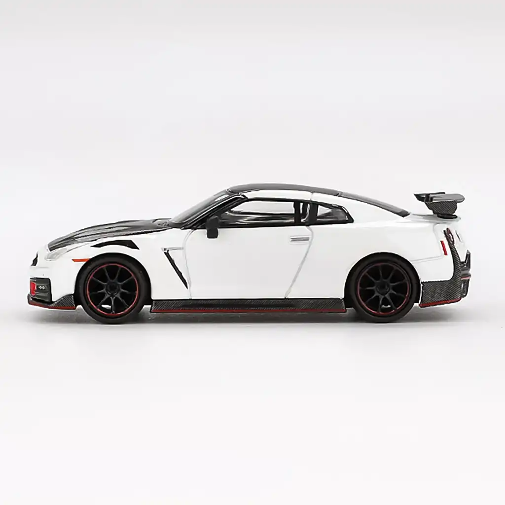 R35 GT-R’ın 2024 Nismo yorumu, Mini GT kalitesiyle 1:64 ölçekte “Brilliant White Pearl” rengiyle sunulur. Döküm metal gövde, Nismo’ya özgü tampon/ızgara tasarımı, arka spoyler ve difüzör görünümü, gerçekçi jant-fren seti ve serbestçe dönen kauçuk lastikler, vitrinde ve dioramanda güçlü bir duruş sağlar. İnce baskılar (Nismo çizgileri/kırmızı vurgular) modelin pist ruhunu öne çıkarır.