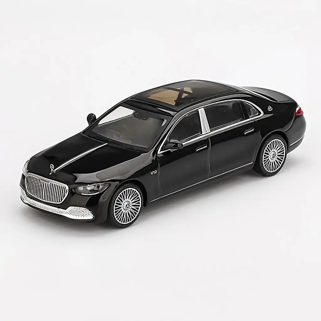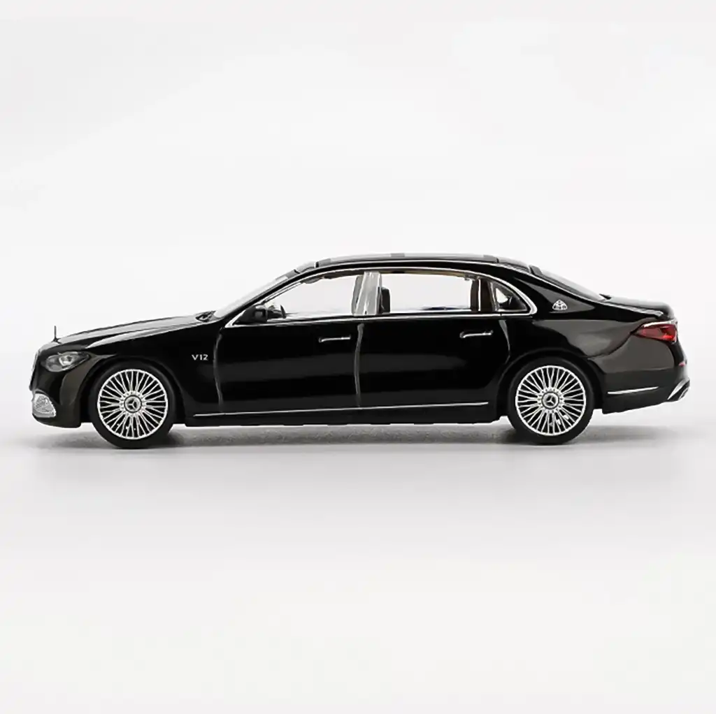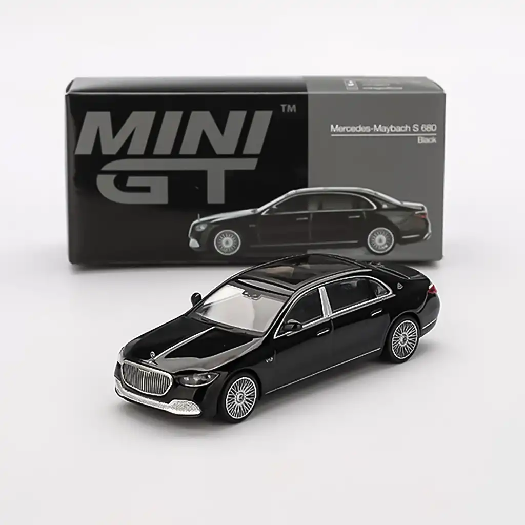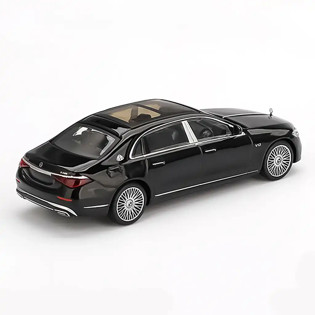 Mercedes-Maybach S 680’in şık siyah dış görünümü, Mini GT kalitesiyle 1:64 ölçekte premium detaylarla buluşuyor. Krom efektli Maybach ızgara, ince far/stop baskıları, gerçekçi jant-fren seti ve serbestçe dönen kauçuk lastikler vitrinde zarif bir duruş sağlar.