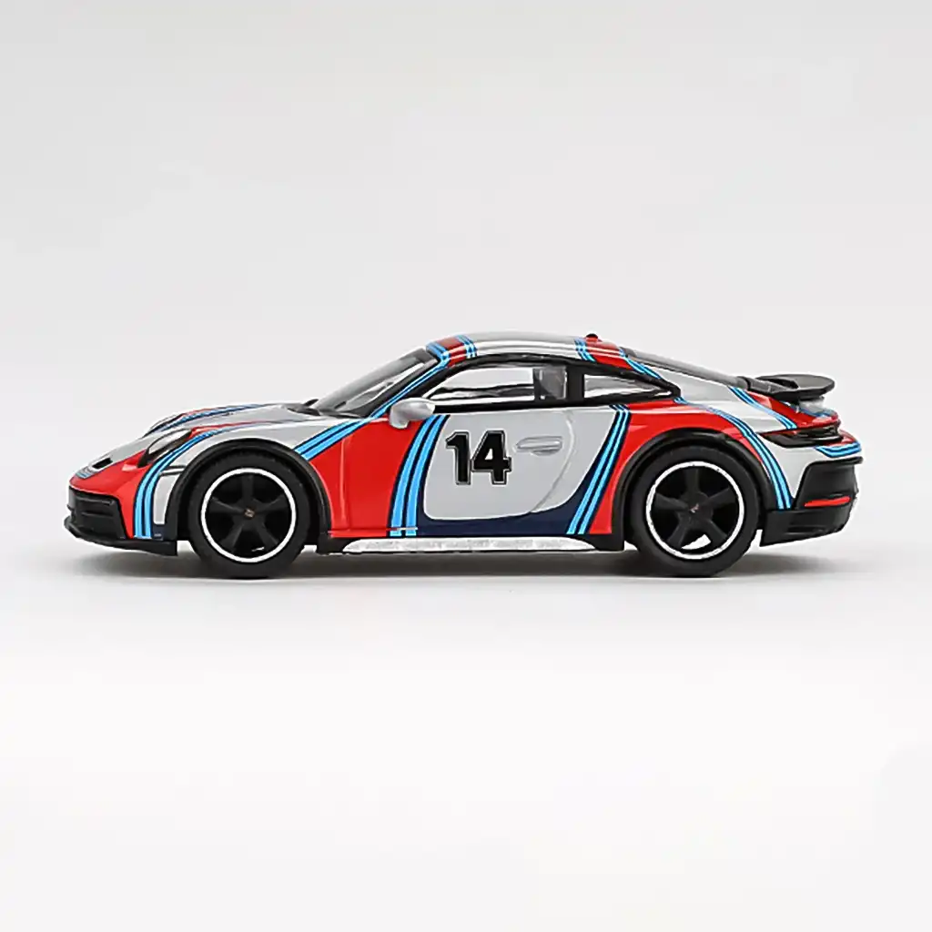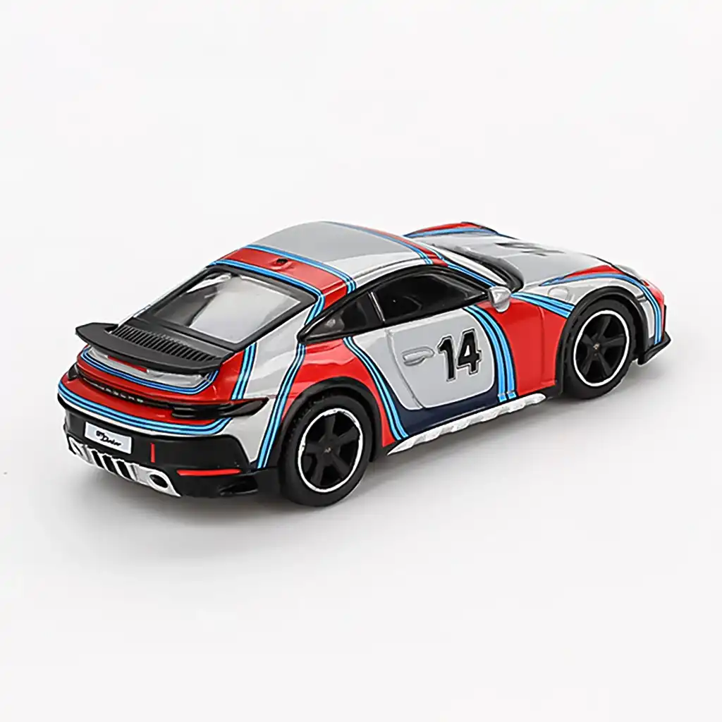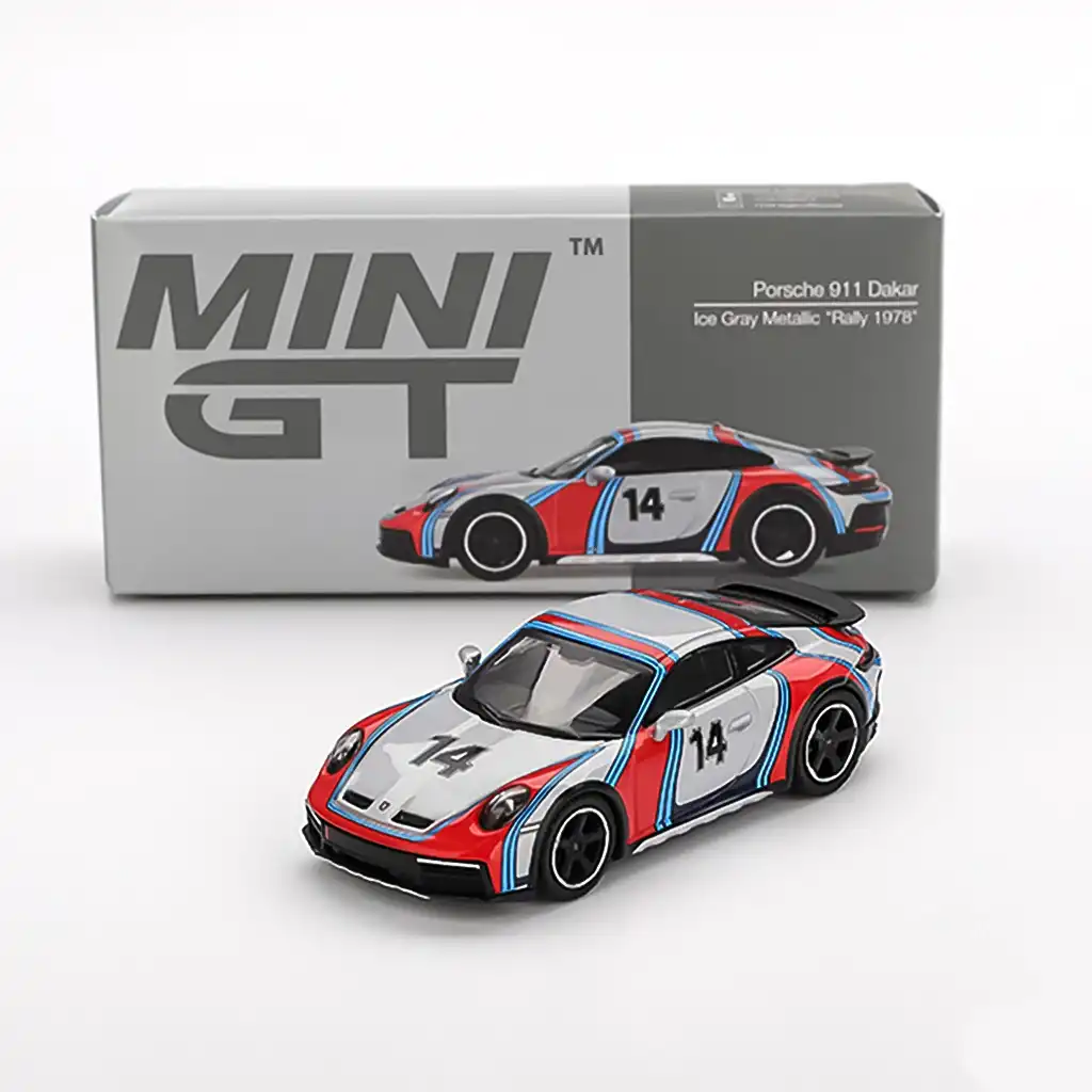 Klasik ralli ruhunu modern 911 Dakar çizgileriyle buluşturan bu Mini GT model, “Ice Grey Metallic” rengi ve 1978 ralli temalı kaplamasıyla öne çıkar. Döküm metal gövde, gerçekçi jant-fren detayları ve serbestçe dönen kauçuk lastikler; diorama ve vitrin kullanımında doğal bir görünüm sağlar. Off-road karakterini vurgulayan tampon, ızgara ve yan şerit baskıları yüksek çözünürlüklüdür.