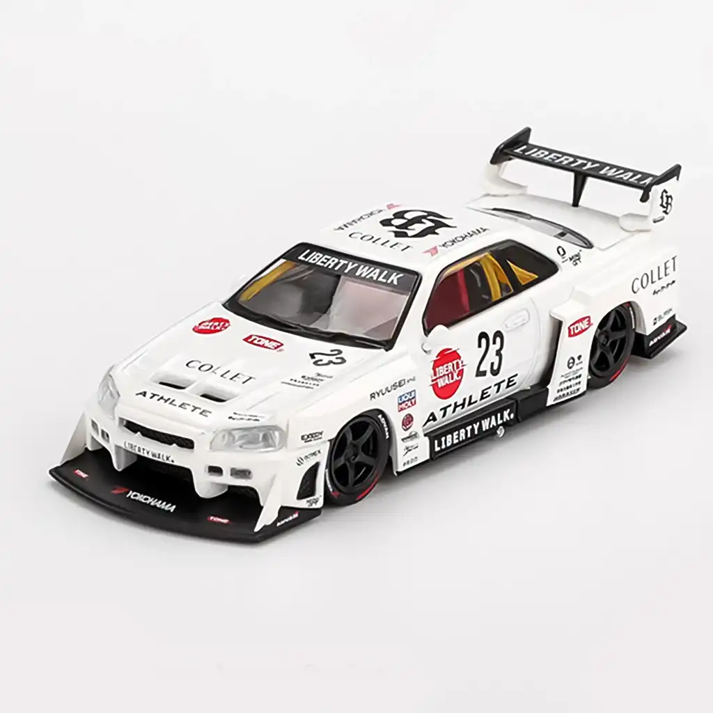 Mini GT 1/64 Nissan LB-ER34 Super Silhouette ATHLETE/COLLET, 80’lerin Super Silhouette yarış kültürünü modern Liberty Walk dokunuşuyla bir araya getiren etkileyici bir koleksiyon modelidir. Geniş çamurluk yapısı, agresif ön splitter, dev arka kanat ve yarış temalı detaylar Mini GT’nin yüksek hassasiyetli diecast işçiliği ile kusursuz şekilde sunulmuştur. ATHLETE/COLLET temalı grafikler modelin koleksiyon değerini artırırken, metal gövde ve gerçekçi jant-lastik kombinasyonu hem Nissan Skyline severlere hem de LBWK koleksiyoncularına hitap eden üst seviye bir görünüm sağlar. Yarış ruhunu 1/64 ölçekte güçlü şekilde yansıtan özel bir modeldir.